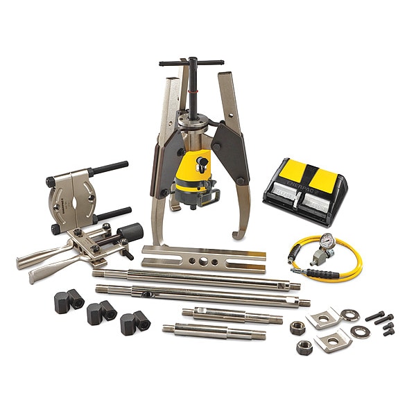 Hydraulic Puller Set, Cylinder Nominal Capacity 64 ton, Stroke Length 3 in, Capacity with Attachments 25 ton, Number of Jaws 3, Max. Jaw Spread 25.98 in, Min. Jaw Spread 9.06 in, Max. Reach 16.06 in, Max. Pressure 10,150 psi, Application For Pushing or Pulling, Includes Air Pump, Cross Bearing Puller. Bearing Separator. Bearing Cup Puller, Hollow Plunger Cylinder, Hose, Jaw Puller, Replacement Point Protector, Weight 307 lb