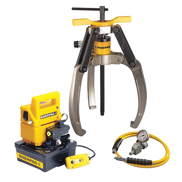 Hydraulic Puller Set, Cylinder Nominal Capacity 24 ton, Stroke Length 2 in, Capacity with Attachments 24 ton, Number of Jaws 3, Max. Jaw Spread 18.9 in, Min. Jaw Spread 6.5 in, Max. Reach 13.23 in, Max. Pressure 10,150 psi, Application For Pushing or Pulling, Includes Electric Pump, Hollow Plunger Cylinder, Hose, Jaw Puller, Pressure Gauge, Replacement Point Protector, Threaded Hollow Saddle, Weight 106 lb
