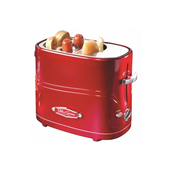 The Nostalgia Retro Pop-Up Hot Dog Toaster with Mini Tongs is a great way to create a simple yet great dish for your family and friends. Keep things quick and easy while preparing a meal everyone loves. This hot dog toaster features a hot dog cage that fits two regular-size or extra-plump hot dogs. You can also use pre-cooked chicken dogs turkey dogs and even veggie dogs in this convenient and reliable hotdog toaster. For a faster preparation time you can also toast two buns at once. Adjust the heat setting and toast the hot dogs and buns to your preference. When done simply remove the hot dog cage using the mini tongs included in the package. Dress your hotdog sandwich and add all of your favorite toppings like mustard ketchup relish and more! Enjoy having friends over for movie and game nights and any other occasion. Entertain with less preparation with the help of this trusty hot dog toaster that will make snacks so much easier to make and prepare.