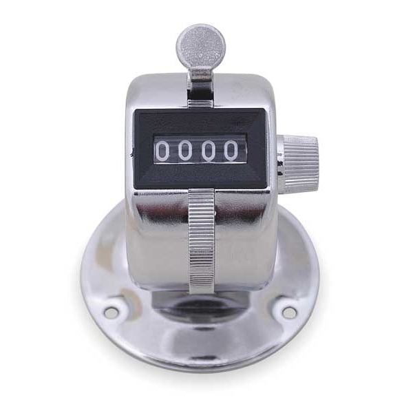 Mechanical Tally Counter, Input Type Hand Operated, Number of Digits 4, Mounting Bench Top, Height 2.76 in, Depth 1.81 in, Width 1.55 in, Display White Digits, Black Background, Reset Type Knob, Color Silver
