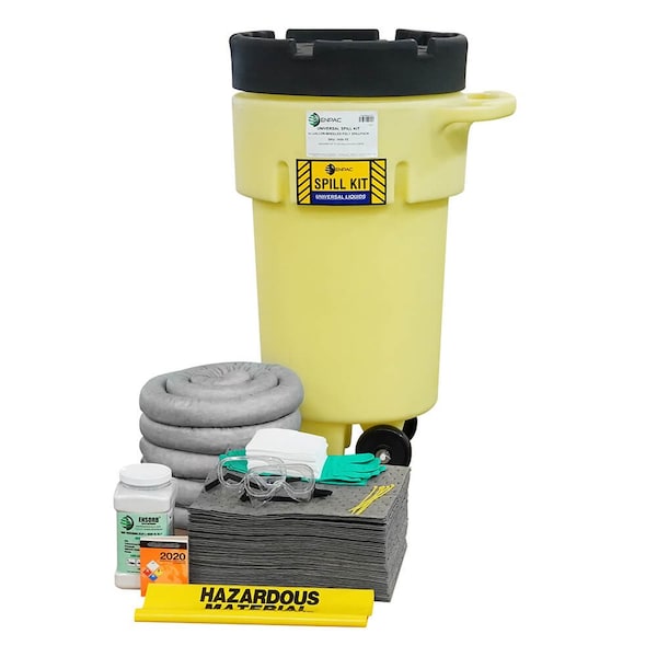 When a spill occurs, time becomes the most valuable asset. Rapidly respond to any spill with these easy-access kits. Universal absorbents will soak up just about any liquid spilled, including water. Non-threaded lid for quick retrieval of contents. Wheeled for easy maneuverability. Durable and chemically resistant. Includes: 1 50-Gallon Wheeled Poly SpillPack, 1 Gallon Jug ENSORB, 40 Mediumweight Universal Pads, 5 Large Universal Socks, 1 Pack Wipers, 4 Disposal Bags and Ties, 2 Pair Nitrile Gloves, 2 Goggles, 1 Emergency Response Guidebook, 1 Instruction Sheet and SDS.