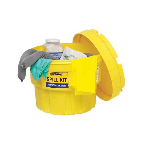 Spill Kit/Station, Fluids Absorbed Chemicals, Hazardous Materials, Volume Absorbed Per Kit 11 gal, Container Type Drum, 31 gal Container Capacity, 24 in W x 24 in L x 19 in H Container Size, Yellow, Sorbents Included (20) Universal Absorbent Pads, (6) Medium Universal Socks, 1 gal Jug ENSORB, Large Universal Socks, PPE Included (1) Pair Goggles, (1) Pair Nitrile Gloves, Additional Components Included 20 gal Salvage Drum, Emergency Response Guidebook, Instruction Sheet, Pack Wipers, SDS
