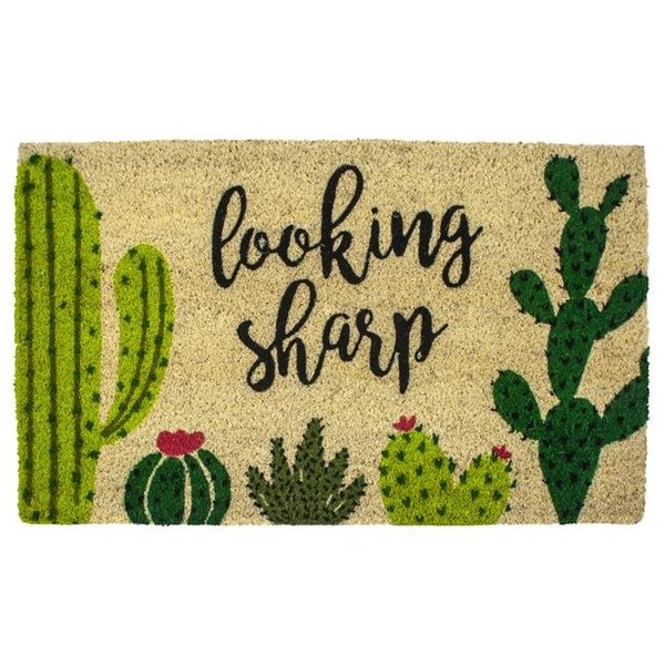 A quintet of colorful and playfully rendered cactus varieties line up beneath a humorous play-on-words greeting on our "Looking Sharp" doormat. Measuring 17" by 28" and featuring a slip-resistant PVC backing, this coir doormat is hand-stenciled with permanent fade-resistant dyes.