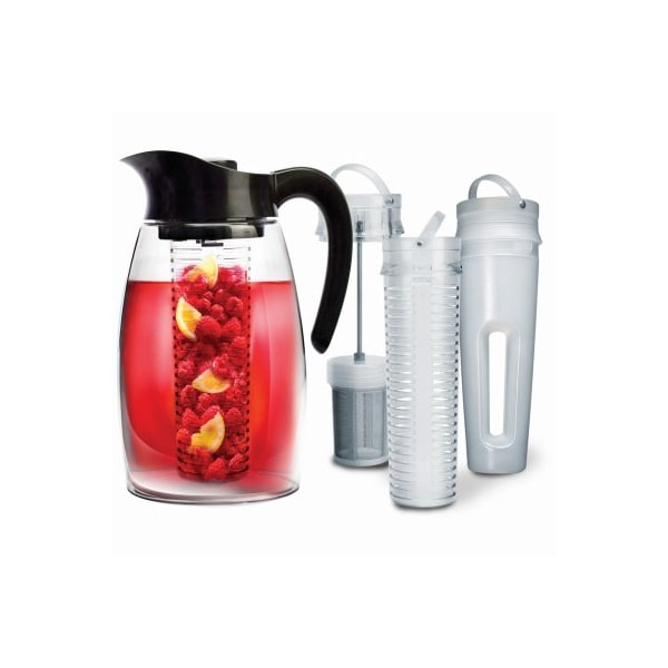 The Flavor It Pitcher 2.9QT includes Tea Chill infusion and chill core. Whether youre brewing hot or cold tea infusing fresh fruit flavor into water infusing mint or lavender into lemonade it is an eco friendly alternative to bottled beverages. The perfect pitcher along with trend forward accessories makes beverage preparation easy. The pitcher tea infuser lid and top are dishwasher safe. The beverage system includes the Flavor infuser which can be filled with fresh fruit herbs or spices to lend intriguing flavor to water tea and more. The Stainless Tea Infuser designed to brew loose tea or ground coffee either hot or cold. The infusers filter sits low in the pitcher accommodating small quantities as well as a full pitcher. The Chill core filled with non-toxic gel it is better than ice because it keeps the beverage cool without diluting the flavor. The package includes one Black 2.9QT Primula Beverage System pitcher Fruit Infuser core Tea infuser core