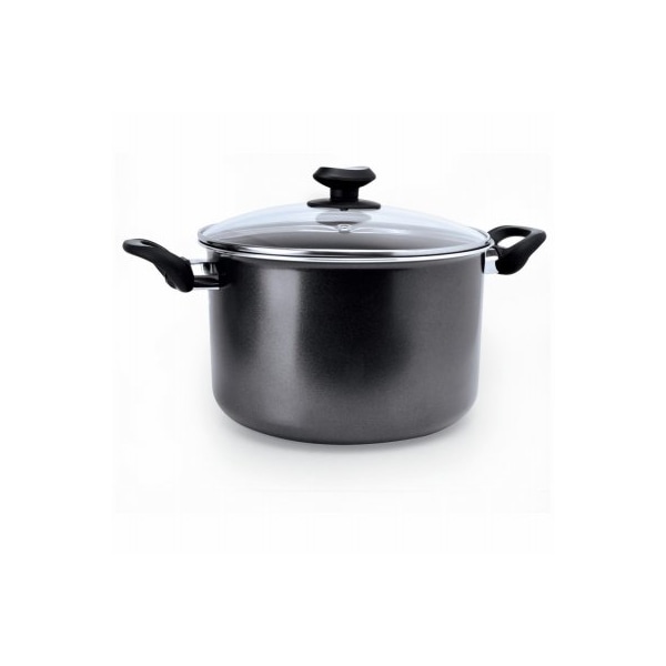 The Elements non stick 8 quart stock pot with glass lid is crafted of pure aluminum with a scrolled bottom to ensure even heating and features our safe water based Hydrolon non stick coating for easy food release The tempered glass lid lets you look at what's cooking under the cover and has a steam vent to prevent overflowing, while still locking in the right amount of moisture in food The ergonomic handles provide a safe and comfortable grip and the superior non stick coating prevents food from sticking, allowing you to use less oil for healthier meals The non stick coating features an advances water based non stick coating that is manufactured without PFOA Dishwasher safe