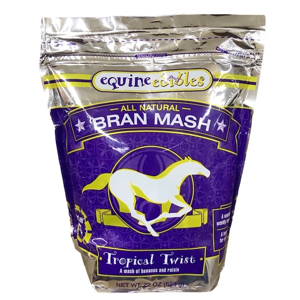 Equine Edibles Therapeutic Bran Mash Tropical Twist is a fun twist on the original recipe. Still bursting with peppermint, tropical twist is made with bananas and raisins for a cool twist of tropical delight. The all-natural bran mash is packaged in a stand-up, waterproof and resealable pouch. Just add water! Bran can be made with hot water (cool season) or cool water (warm season).MADE IN AMERICA
