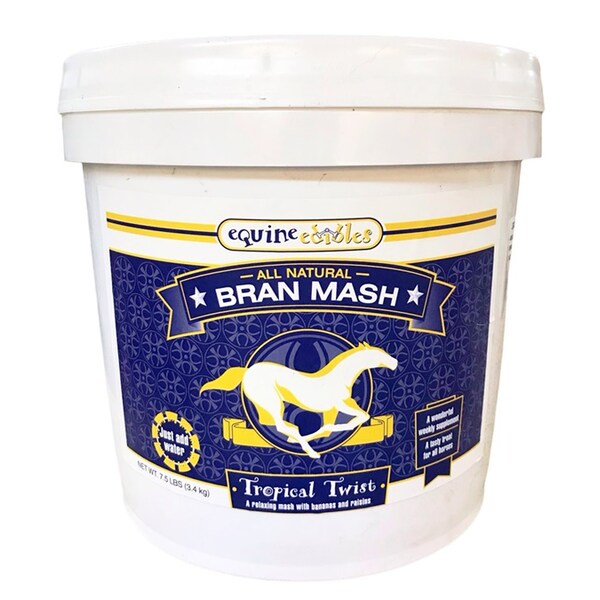 Equine Edibles Therapeutic Bran Mash Tropical Twist is a fun twist on the original recipe. Still bursting with peppermint, tropical twist is made with bananas and raisins for a cool twist of tropical delight. The all-natural bran mash is prepackaged in a pail and contains 5-6 servings of mash. Just add water! Bran can be made with hot water (cool season) or cool water (warm season).MADE IN AMERICA