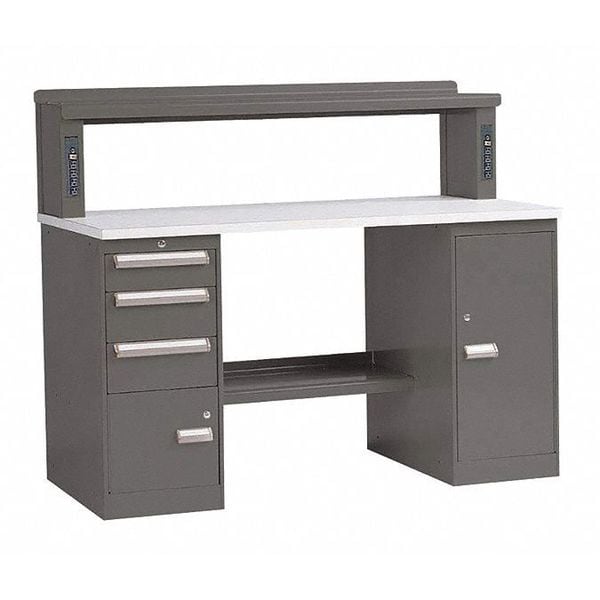 Workbench, Height Adjustability Fixed Height, Top Material Laminate, Assembly Unassembled, Color Gray, Frame Material Steel, Leg Type Pedestal Cabinet Base, Maximum Adjustable Height Not Applicable, Minimum Adjustable Height Not Applicable, Non-Metal Top Thickness 1 1/4 in, Number of Drawers 3, Included Components Lower Shelf, Riser, Number of Shelves 2, Overall Depth 30 in, Overall Fixed Height 33 1/2 in, Overall Load Capacity 200 lb, Overall Width 72 in, Standards UL Listed