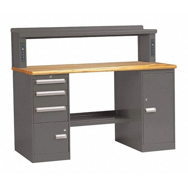 Workbench, Height Adjustability Fixed Height, Top Material Hardwood, Assembly Unassembled, Color Gray, Frame Material Steel, Leg Type Pedestal Cabinet Base, Maximum Adjustable Height Not Applicable, Minimum Adjustable Height Not Applicable, Non-Metal Top Thickness 1 3/4 in, Number of Drawers 3, Included Components Lower Shelf, Riser, Number of Shelves 2, Overall Depth 30 in, Overall Fixed Height 33 1/2 in, Overall Load Capacity 200 lb, Overall Width 72 in, Standards UL Listed