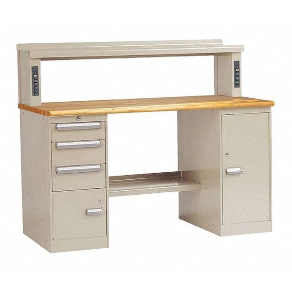 Workbench, Height Adjustability Fixed Height, Top Material Hardwood, Assembly Unassembled, Color Beige, Frame Material Steel, Leg Type Pedestal Cabinet Base, Maximum Adjustable Height Not Applicable, Minimum Adjustable Height Not Applicable, Non-Metal Top Thickness 1 3/4 in, Number of Drawers 3, Included Components Lower Shelf, Riser, Number of Shelves 2, Overall Depth 30 in, Overall Fixed Height 33 1/2 in, Overall Load Capacity 200 lb, Overall Width 60 in, Standards UL Listed