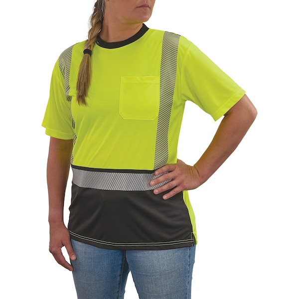 The GloWear 8276BK Women's Performance Hi-Vis T-Shirt is designed with a focus on both safety and comfort, offering a range of features that ensure optimal performance throughout the workday. ANSI/ISEA 107-2020, Type R, Class 2 compliant fabric has 2in reflective, segmented tape to ensure visibility in low-light and nighttime situations.DESIGNED FOR WOMENThe design of this shirt offers a functional fit specifically tailored for women, with narrower shoulder seams, a slightly contoured waist, short side slits, a slightly longer back and shorter sleeves. Crafted with care to follow the natural shape of a woman's body, this design ensures a comfortable fit for a variety of body types, helping working women to look and feel their best on the job. Made with polyester dobby (5oz), a lightweight material that offers breathability and ensures that workers stay comfortable on the job. The polyester construction also provides durability, so the garment can withstand the rigors of daily work without compromising on comfort. The black panel across the bottom hides dirt, grit and dust to keep the shirt looking cleaner longer.Anti-microbial technology works to reduce the growth of bacteria and minimize odors to maintain freshness throughout the day. Moisture-wicking technology further enhances the garment's functionality, pulling sweat away from the body to keep the wearer cool, dry and comfortable, even during intense physical activity.UPF 50+ sun protection shields your skin from harmful UV rays and reduces the risk of sunburn or long-term skin damage, making it a great option for outdoor work in sunny conditions. For added convenience a chest pocket provides a practical space for storing small items like pens, tools or ID badges, keeping them easily accessible while you're on the job.The shirt is machine washable and retains its shape even after up to 50 washes, ensuring longevity and easy maintenance. Ideal for construction workers, transportation workers or anyone who requires a Class 2 level of protection and visibility.