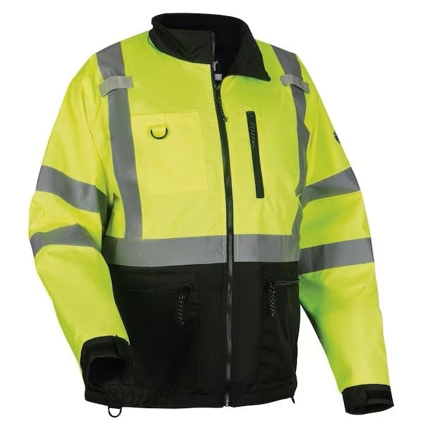 Adjustable hook andamp; loop cuffs seal out cold and allow for comfortable low-bulk wear with gloves. This windbreaker features an elastic bungee waist for a snug and adjustable fit that keeps cold air out. A zippered closure makes for easy on and off. This Type R Class 3 lightweight hi-vis jacket features 2 lower front pockets, 1 upper chest cell phone pocket, 1 dual slot pen pocket, 1 zippered fleece-lined interior pocket, 3 d-rings and 2 mic tabs for convenient access and storage.