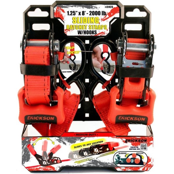 31423 1.25 in. x 8 ft. 2000 lbs Sliding Ratchet Straps with Caplocks, 2PK
