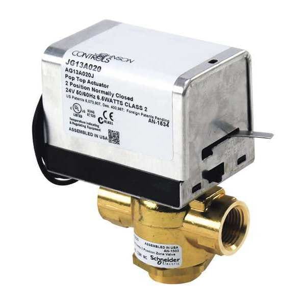 Zone Valve, Actuator Control Signal On/Off, Actuator Return Action Spring Return, Actuator Voltage 24V AC, Application Chilled/Hot Water Control, Body Material Brass, Body Pattern Three-Way, Close-Off Pressure 25 psi, Coefficient of Volume (Cv) 4, Contact Form SPDT, Electrical Lead Length 18 in, Fluid Temperature - Maximum 200 Degrees F, Fluid Temperature - Minimum 32 Degrees F, For Media Water, Frequency 50/60 Hz, Includes Actuator Actuator Included