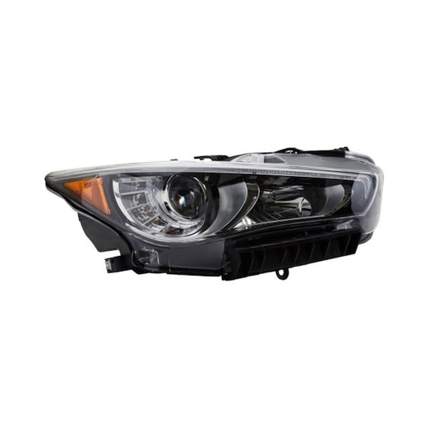Passenger Side Headlight, Infiniti Q50 Black/Chrome/Clear w/Projector LED Low/High Beam CAPA Cert
