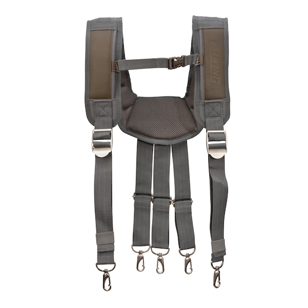 Designed and constructed for maximum utility and ultimate reliability, this Estwing suspender rig combines top grain cowhide leather and 1800D polyester to provide heavy-duty support. The cooling liner has a core of lightweight foam padding for extra comfort and the mesh allows breathability in hot conditions. 5 steel clasps allow the suspenders to attach to the D-rings located on most tool belts. A length and height adjustable chest strap keeps the rig secure and in a comfortable position for long duration wear. For ease of transport a durable ABS plastic and webbing handle is located on the back, giving you a secure hold when transporting a fully loaded tool rig to and from the jobsite.