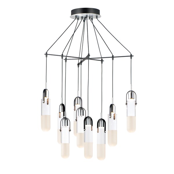 Glass vessels of Frost and Clear are illuminated by LED concealed in Brushed Aluminum domes which suspend from Black fabric wire to create this exclusive design. Unique separators add a unique design element that brings this collection to another level.