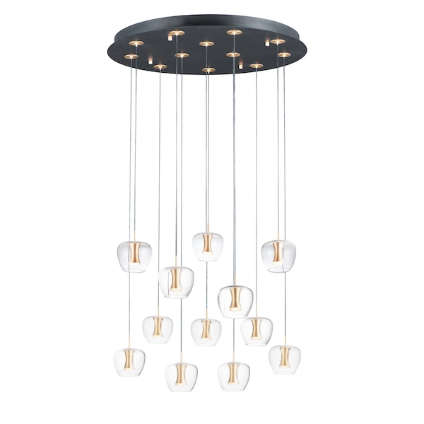 Clear apple shaped glass rest on machined aluminum fonts finished in Satin Brass with integrated LED for even Illumination without the glare. The large scale 25 light comes pre-arranged for ease of installation and is perfect for that tall ceiling application.