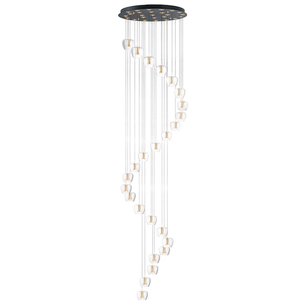 Clear apple shaped glass rest on machined aluminum fonts finished in Satin Brass with integrated LED for even Illumination without the glare. The large scale 25 light comes pre-arranged for ease of installation and is perfect for that tall ceiling application.