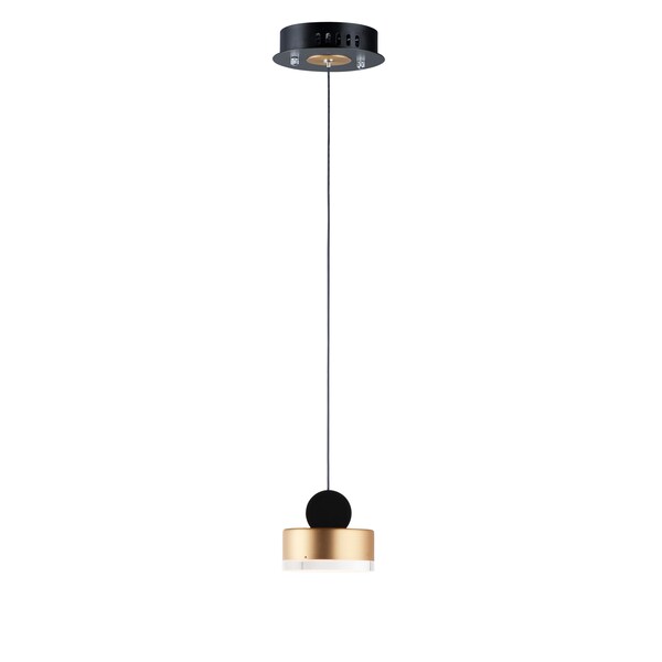 These geometric pendants can be arranged at various heights to create both a sculptural and functional form. Housings of plated Gold in various shapes and sizes are topped with a round handle of Black and finished on the bottom with a Clear acrylic diffuser.