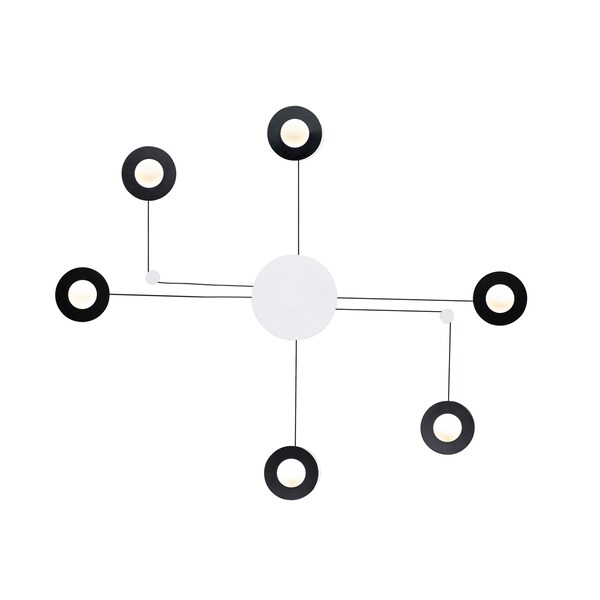 A creative way to add light to any room, this collection can be arranged into many configurations. Simply install the main canopy and position the Moons to your desired location within 3 feet from the center. Each Moon is finished in White on the backside and Black on the face. The face can move from side to side as well in an outward direction.