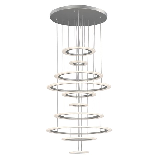 A new variation of a very popular series with many different configurations many of which are large scale for commercial applications. Metal rings of Matte Silver support horizontal acrylic diffusers which glow when illuminated by dimmable LED.