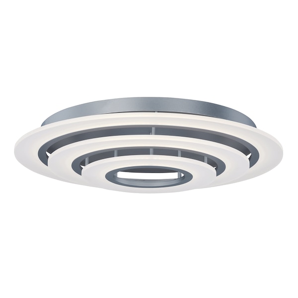A new variation of a very popular series with many different configurations many of which are large scale for commercial applications. Metal rings of Matte Silver support horizontal acrylic diffusers which glow when illuminated by dimmable LED.