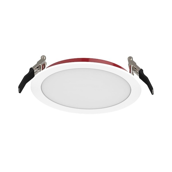 ETI FRCDL Fire-Rated Canless Downlight, 120 V, Wattage Rating: 14 W, Trim Type: Ultra Thin, Lamp Base: Integrated, Lamp Type: LED, Lamp Wattage: 75 W, Insulation Type: IC, Recessed Mounting, Average Life: >72,000 hr, Lumens: 1200 Lumens, Color Temperature: 2700, 3000, 3500, 4000, 5000 K, Color Rendering Index CRI: 90, Recessed Can Diameter: 6 in, Trim Color: White, Trim Material: Steel, Polycarbonate, Dimmable: Dimmable, Dimensions: 6.812 in Dia x 2.375 in H, Temperature Rating: -4 to 104 deg F
