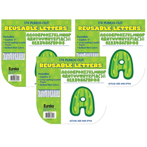 An easy way to create personalized classroom messages on bulletin boards, windows, chalkboards and hallways. Each punch-out, reusable letter is printed on long-lasting coated paper in brilliant, rich colors. Individual letters each measure 4". Coordinates with the A Sharp Bunch collection. Each set includes 178 characters. Sold as 3 packs for a total of 534 characters.