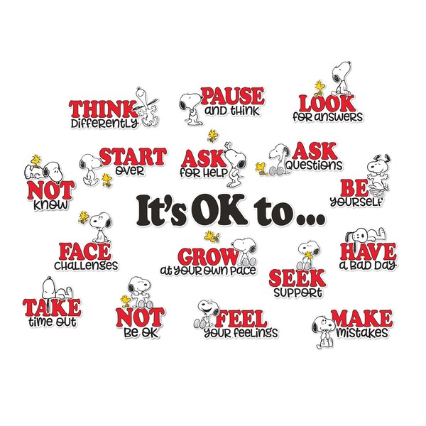 Use the Peanuts ''It's OK To..'' bulletin board set to remind students that it is ok to feel their feelings! Bring the characters from the beloved Peanuts gang right to your classroom! Mix and match pieces for the perfect look! All pieces are printed on heavy weight cardstock and are reusable. Each piece is die-cut and easy to punch out, making assembly a breeze. Each 42-piece set includes 4 panels with: a 4-piece ''It's OK to..'' header, 15 phrase pieces, and 22 die-cut characters.