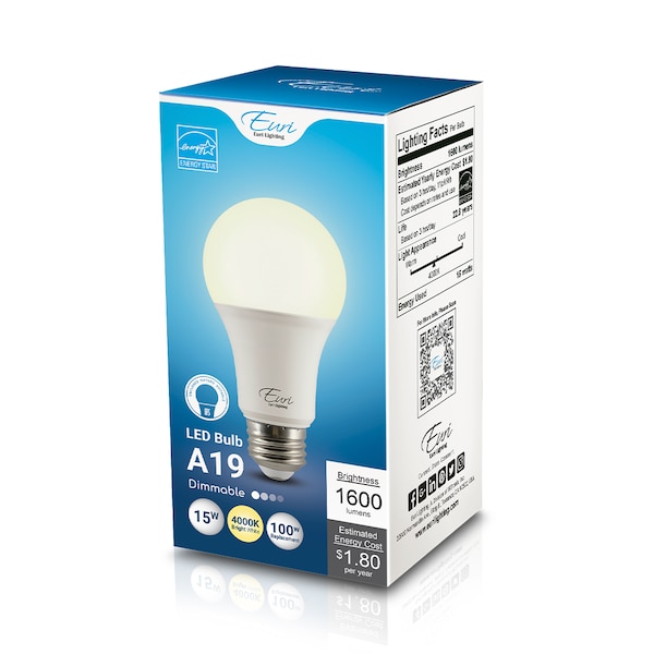 LED EA19-15W2040e, Omni-directional A19, replaces conventional 100 Watt incandescent bulbs delivering more brightness (lumens) for less energy (Watts). With lower energy consumption levels you will be able to experience considerable energy savings throughout the years. EA19-15W2040e design reduces internal bulb heat providing greater durability and constant bulb performance. Look for EA19-15W2000e for Soft White (3000K), EA19-15W2020e for Warm White (2700K) and EA19-15W2050e for Cool White (5000K). Enjoy features such as: Dimming options, Energy Efficient, and Enclosed Fixture Suitable.