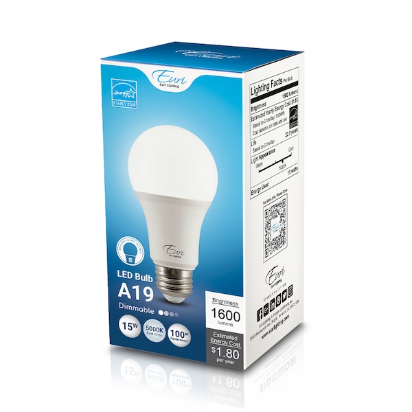 LED EA19-15W2050e, Omni-directional A19, replaces conventional 100 Watt incandescent bulbs delivering more brightness (lumens) for less energy (Watts). With lower energy consumption levels you will be able to experience considerable energy savings throughout the years. EA19-15W2050e design reduces internal bulb heat providing greater durability and constant bulb performance. Look for EA19-15W2000e for Soft White (3000K), EA19-15W2020e for Warm White (2700K), and EA19-15W2040e for Bright White (4000K). Enjoy features such as: Dimming options, Energy Efficient, and Enclosed Fixture Suitable.