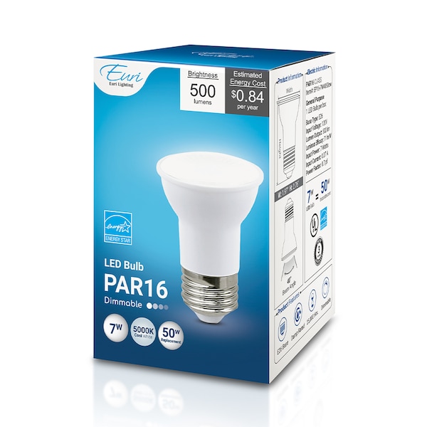 EP16-7W4050ew delivers superior brightness, valuable energy savings, and long-lasting performance. This PAR16 LED bulb is ideal for ambient lighting or general-purpose applications due to its uniform *Cool White Light (5000K) and replaces conventional 50 Watt incandescent light bulbs.Look for EP16-7W4000ew for Soft White (3000K), EP16-7W4020ew for Warm White (2700K) and EP16-7W4040ew for Bright White (4000K).