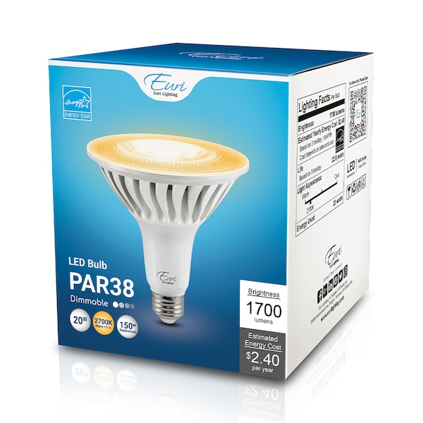 LED EP38-20W6021e delivers superior brightness, valuable energy savings, and long-lasting performance. This PAR38 LED Long Neck bulb is ideal for ambient lighting or general-purpose applications due to its uniform *Warm white light (2700K) and replaces conventional 150 Watt incandescent light bulbs. Look for EP38-20W6001e for Soft White (3000K), EP38-20W6041e for Bright White (4000K) and EP38-20W6051e for Cool White (5000K). Enjoy features such as: Instant-on, dimming options, and mercury-free.