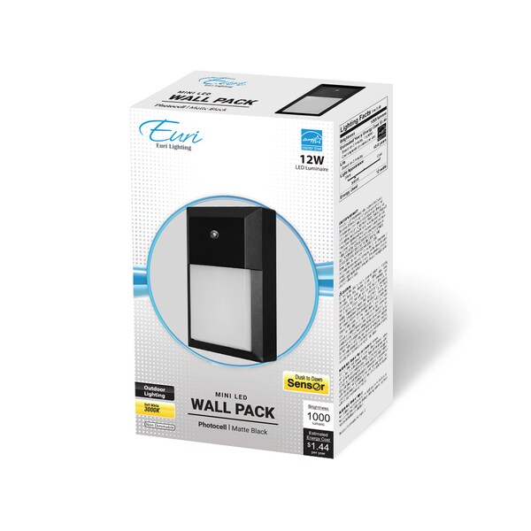 Durable and dependable, this Euri Lighting LED wall light is designed with black aluminum housing and a frosted polycarbonate lens made to withstand damaging weather conditions. Built for ultimate energy efficiency, this sleek and clean outdoor mini wall pack offers Dusk-to-Dawn technology, turning on and off with the rising and setting of the sun. Available in welcoming Soft White (3000K) this wall light is perfect for any home porch or patio.
