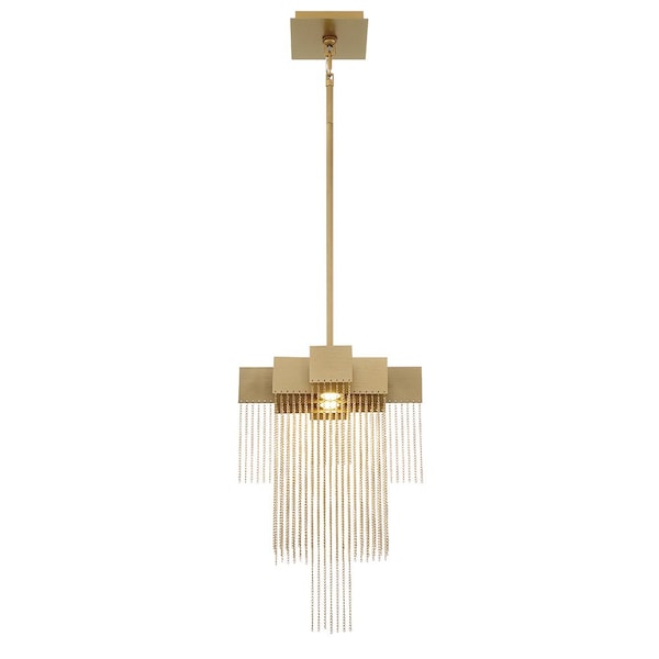 A lustrous collection of delicate, high-gloss metal chains cascade like gleaming streams of water in this transitional piece. Resembling armored chain mail, the polished, plated mesh envelops each integrated LED light to add a soft, shimmering glow.