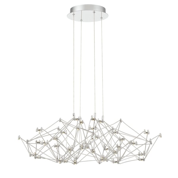 Dozens of twinkling LED lights are arranged in geometric shapes at the end of fine rods which give this light, airy chandelier the appearance of floating effortlessly above.
