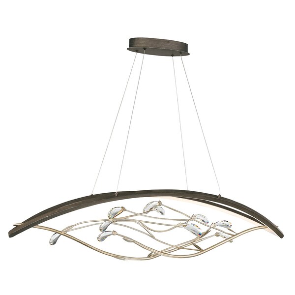 Arched LED frame with suspended organic bronze metal branches and clear crystal accents