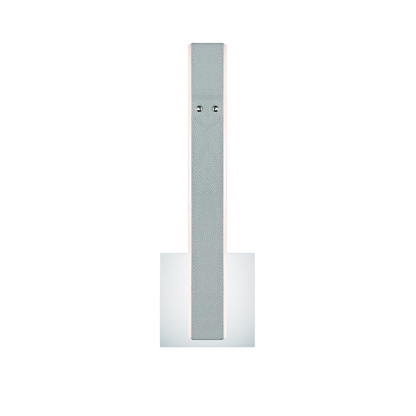 "The Verdura collection features vegan leather, accentuated by decorative silver studs. The two-toned fabric highlights one color on the inside while displaying a complementary second color on the outer ring. The textured grooves are highlighted by the luminous glow of integrated LED lights that are encased between. This collection is not only abundant in size but also in the number of fixtures offered.