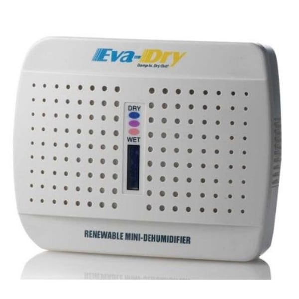 This mini dehumidifier has been design to adsorb moisture from small enclosed areas. It will help protect clothes and valuables from the damaging effects of mold/mildew and moisture rot. It is 100% renewable and needs no power to operate. Just hang the eva-dry unit in a closet, or you can place it in other small enclosed spaces, and it will start to adsorb moisture. There are no batteries required or cords to plug in, the unit works without power. There is an indicator window with special "moisture meter crystals" that change from blue (when dry) to pink (when wet) to indicate when the unit needs to be "re-newed". The unit will adsorb approximately 6 ounces of moisture (depending on humidity levels this should take between 3 - 8 weeks). Once the moisture has been adsorbed it cannot leak or spill. This unit uses a specialized engineered crystallized silica gel that is odorless, non-toxic and completely safe. When the indicator crystals turn pink it is time to "re-new" the unit. Simply remove the unit from where it is adsorbing moisture and plug it into a power outlet in a well ventilated area (bathroom with extraction fan, garage, outside, etc.). There is a built-in heater that will warm the crystals allowing them to expand and release the moisture as water vapor into the outside air. It takes about 8-10 hours to completely re-new the unit. When it is completely renewed the indicator crystals will change back to blue. The unit is brand new again and ready to adsorb another 6 ounces of moisture.The crystals will remain active for 10 years and we offer a 5 year limited manufactures warranty on all EDV300 units.