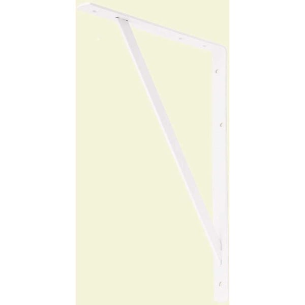 The Everbilt 16 in. x 10 in. Shelf Bracket is ideal for closets, garages, sheds or any shelving needs. Compatible with wood, plastic or metal shelving. Easy to install.Made of steelWhite finishScrews not includedSupports up to 600 lbs.Sold as a single unitUse with #14 x 1-1/2 in. and #12 x 3/4 in. screws