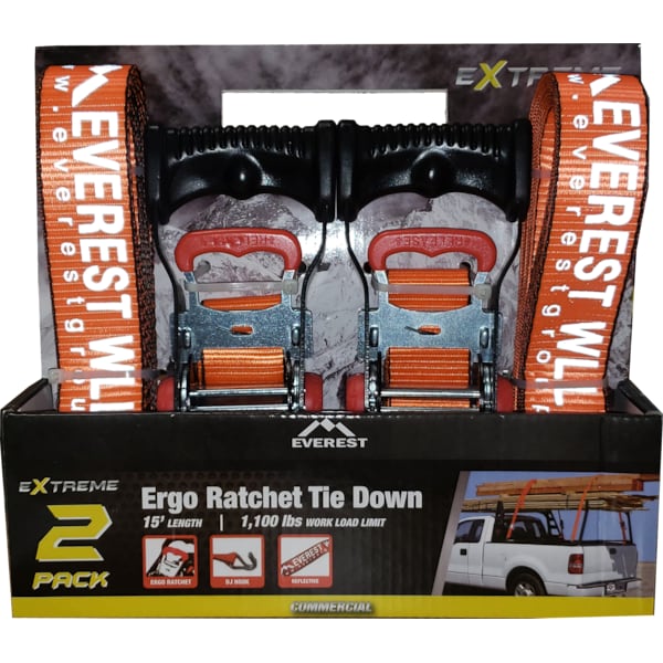 The Everest Ergo Ratchet Tie-Down Straps come with ergonomic handles for ultimate comfort and strength. Their working load limit is 1100 lbs. while the break strength is 3300 lbs. This product comes with a padded lock release to reduce pressure on your wrist making it easier for you to ratchet. Padded end caps minimize abrasion to any cargo you are hauling. The featured double J-hooks fit all anchors. Also includes innovative reflective stenciling which not only looks cool but is an additonal added safety feature when on the road at night.