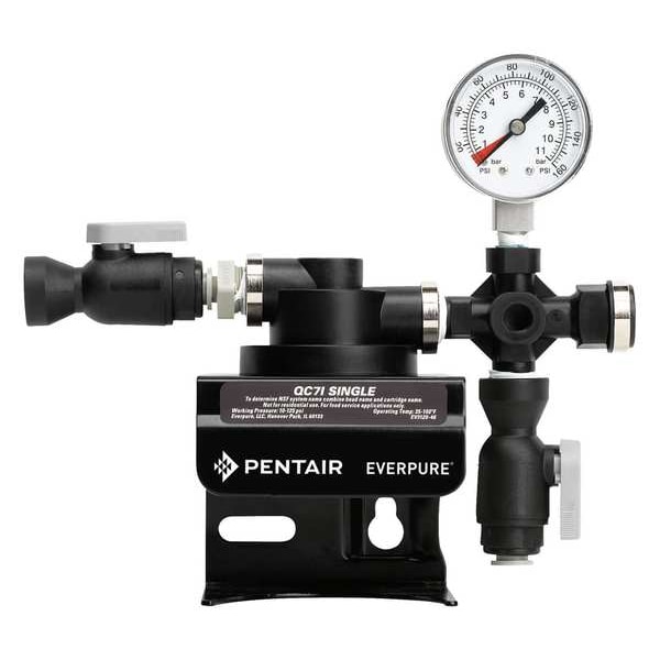 Water Filter Head, Connection Size 3/8 in, Connection Type FNPT, Overall Length 8 1/8 in, Overall Height 7 5/8 in, Overall Width 5 1/4 in, Application Cold Beverage, Drinking Water, Fountain Beverage, Hot Beverage, Ice Machine, Softening, Steam, Features All Wetted Parts Have Passed NSF Extraction Tests, Built-in Water Pressure Gauge Helps Monitor Proper Flow, Will Not Corrode, Includes Mounting Bracket, Screws, Material Plastic, Maximum Pressure 125 psi, Maximum Temperature 100 Degrees F