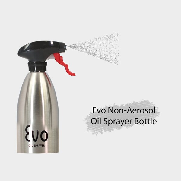 Evo's Stainless Steel Non-Aerosol Oil Sprayer Bottle sprays without harmful propellants or chemicals, requires no pumping or priming, and won't clog Made from 18/8 stainless steel, food-safe, Latex, BPA, and DEHP-free; award-winning design by Michael Graves Design Group MGDG; holds 16-ounces Nozzles rotate horizontally or vertically to spray a unique fan-shape; cover more surface with 1/4-teaspoon for healthy portion and calorie control Heat safe, shatterproof, melt-proof, and aerosol free; perfect for BBQ, grilling, and campfire use Ideal for home and commercial kitchens; bottle is top-rack dishwasher safe; hand wash sprayer and clear the trigger with hot water