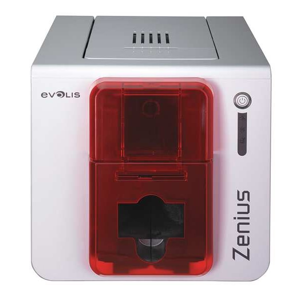 Evolis Card Printer, Single Sided USB and Ethernet, Print Speed 150 Cards/Hour, Resolution 300 dpi, Card Type 10 to 40 mil, Connection USB & Ethernet, Barcodes Yes, Height 8 In., Width 12-1/2 In., Depth 8-1/2 In., Voltage 100 to 240, Print Mode Dye Sublimation, Red