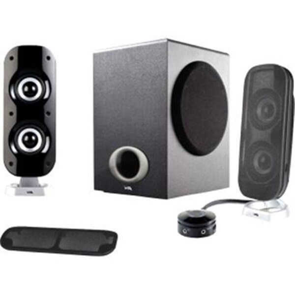 3 piece Powered Speakers. PC Speakers, control pod, aux-in, bass, master vol. Removable grill cover