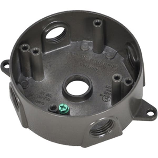 Features -Round Outlet Box. -Color - Bronze. -Five 1/2 in. Holes. -Mounting Lugs. -Closure Plugs. -Ground Screw. -Weatherproof. -Dimension - 5.51 x 4.25 x 1.61 in. -Item Weight - 0.46 lbs.