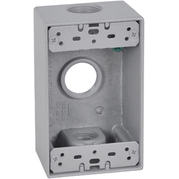 Features -1 Gang Rectangular Outlet Box With Three 0.75 in. Holes. -Color - Gray. -Mounting Lugs. -Closure Plugs. -Ground Screw. -Weatherproof. -Dimension - 4.61 x 2.83 x 2.01 in. -Item Weight - 0.57 lbs.