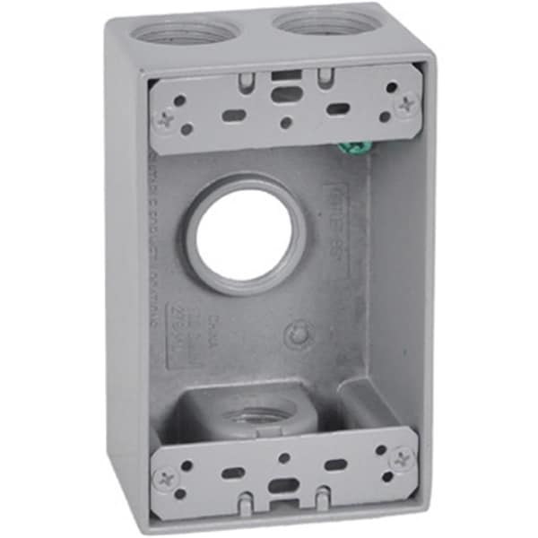 Features -1 Gang Rectangular Outlet Box With Four 0.75 in. Holes. -Color - Gray. -Mounting Lugs. -Closure Plugs. -Ground Screw. -Weatherproof. -Dimension - 4.61 x 2.83 x 2.01 in. -Item Weight - 0.55 lbs.