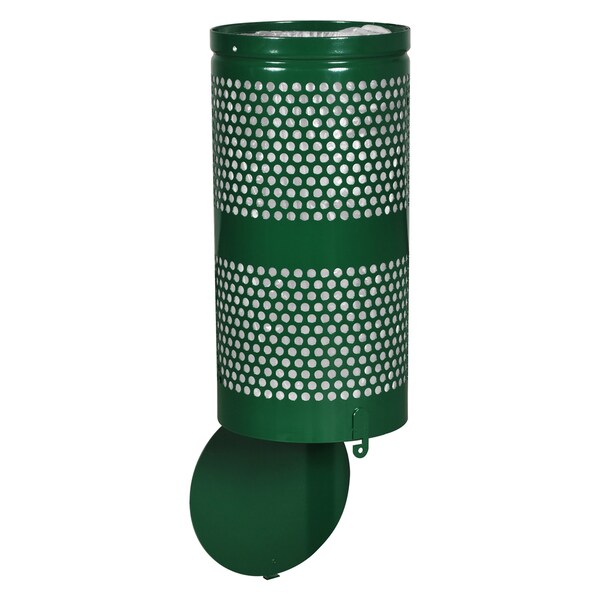 Landscape Series 10-gal perforated waste receptacle with hinged drop bottom for easy emptying and welded bracket for permanent wall/pole mounting in Hunter Green Gloss. Heavy-gauge Steel with fully welded construction and bottom drainage holes prevent water build-up. Pre-drilled mounting holes in back of unit allow for mounting to poles, walls or fences. Optional Mounting Bracket sold separately B-1022. Contains over 30% recycled material and 100% postconsumer recyclable. EXL-COAT powder coat finishes